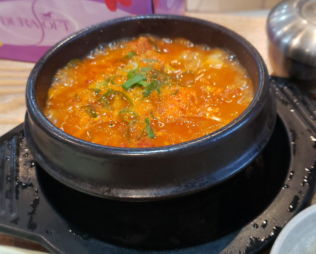 It’s a casual restaurant with a no-frills, relaxed atmosphere. The menu had a good selection of dishes, with the option for individual mains or a hotpot to share. Each diner has to order a dish. We decided on the seafood pancake, pork and kimchi stew, and stir-fried marinated beef.